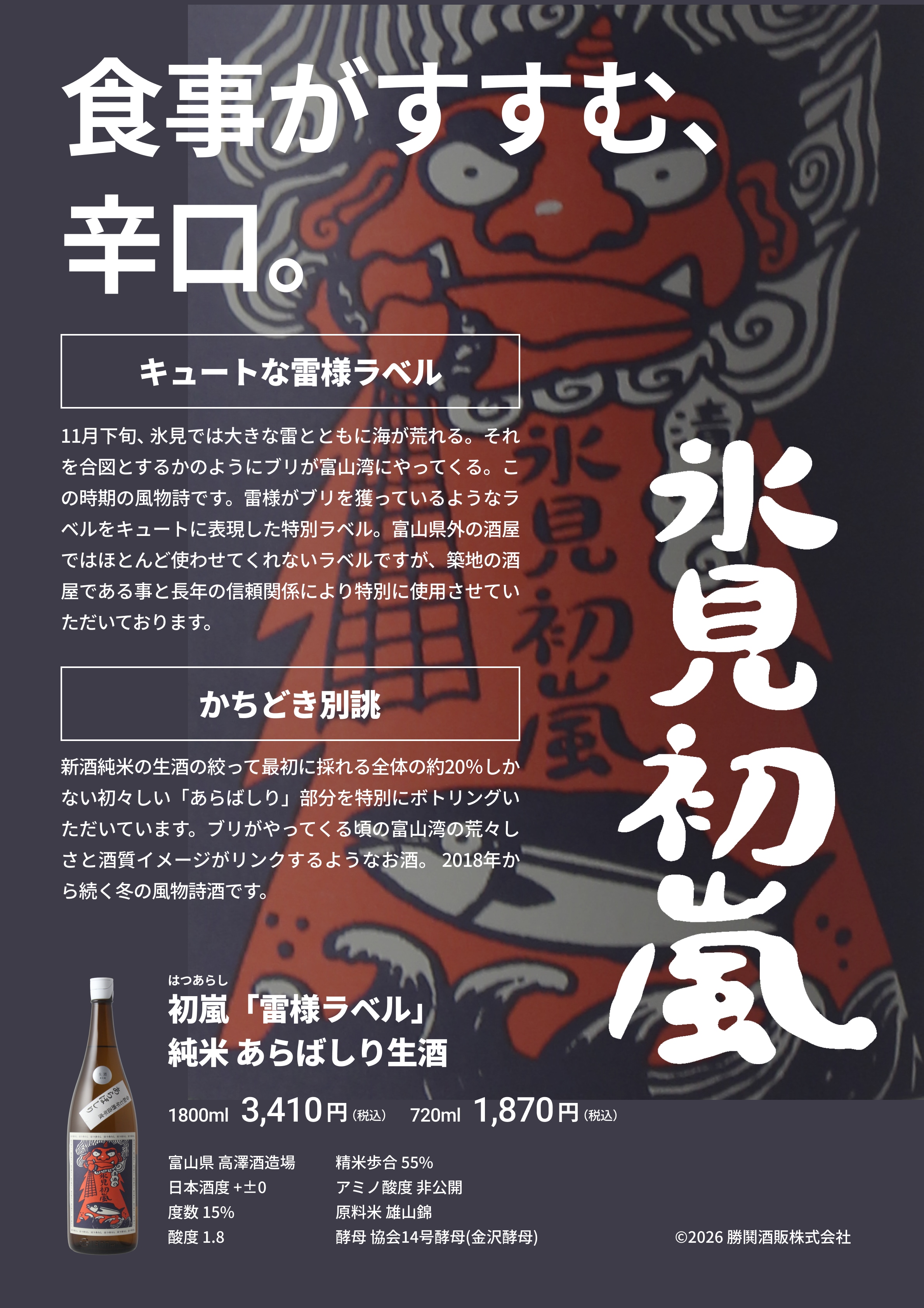 【日本酒/KB】初嵐(はつあらし)「雷様ラベル」 純米 あらばしり生酒 R7BY 720ml ※クール便発送